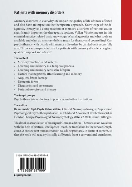 Memory disorders in everyday life impair the quality of life of those affected and also have an impact on the therapeutic approach. Knowledge of the diagnosis, therapy and compensation of memory disorders of various causes significantly improves the therapeutic options. Volker Völzke imparts in this essential practice-related basic knowledge: What diagnostics and what tools are available and what do memory deficits mean for therapy and counselling? Can psychotherapy with people with memory disorders be carried out successfully at all? How can people who care for patients with memory disorders be given qualified support and advice?