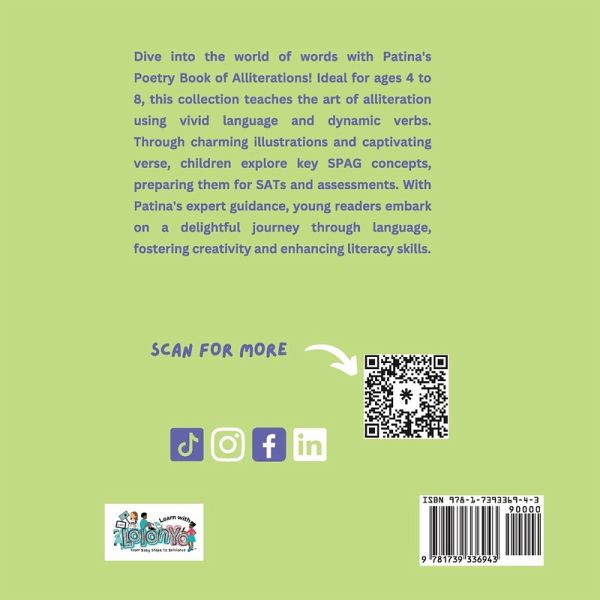 Step into the captivating realm of words with "Patina's Poetry Book of Alliterations"! Designed for children ages 4 to 8, this delightful collection invites young readers on an engaging exploration of the art of alliteration. Crafted by the esteemed wordsmith, Patina, each page offers a delightful blend of rhythmic language, vivid imagery, and playful wordplay. As children immerse themselves in Patina's poetic verses, they not only embark on a journey through the wonders of language but also deepen their understanding of key SPAG concepts. With charming illustrations and captivating verse, this book is sure to spark imaginations and inspire a lifelong love of reading and writing. As young readers immerse themselves in Patina's poetic prose, they are not only transported to a creative realms but also introduced to fundamental SPAG concepts. Through charming illustrations and captivating verse, children embark on a delightful journey through the power of language, nurturing their creativity and enriching their literacy skills. Patina's Poetry Book of Alliterations serves as a valuable tool for young learners, preparing them for the challenges of SATs and other assessments. By engaging with Patina's masterful use of language, children develop a deeper understanding of key SPAG principles, empowering them to excel in their academic endeavors. This delightful collection encompasses a wide array of topics, encouraging children to explore diverse themes such as positive affirmations, the love of writing, holidays at the beach, environmental conservation, community engagement, the importance of family, music and movement, various modes of transportation, the significance of education, and the joy of pet ownership. Through Patina's expertly crafted verses, young readers embark on imaginative journeys where they encounter vibrant characters and explore fascinating landscapes. From bustling city streets to tranquil countryside scenes, each poem offers a unique glimpse into the wonders of the world around us. Whether they are learning about the importance of protecting the environment, celebrating the bonds of family, or embarking on exciting adventures, children are inspired to embrace curiosity, creativity, and compassion. "Patina's Poetry Book of Alliterations" aims to inspire other children to write poetry, fostering a love for language and self-expression. With its engaging content and interactive format, this enchanting book sparks imaginations, ignites passions, and instills a lifelong love of learning. Whether enjoyed independently or shared with family and friends, it is sure to captivate young readers and leave a lasting impression that extends far beyond its pages.