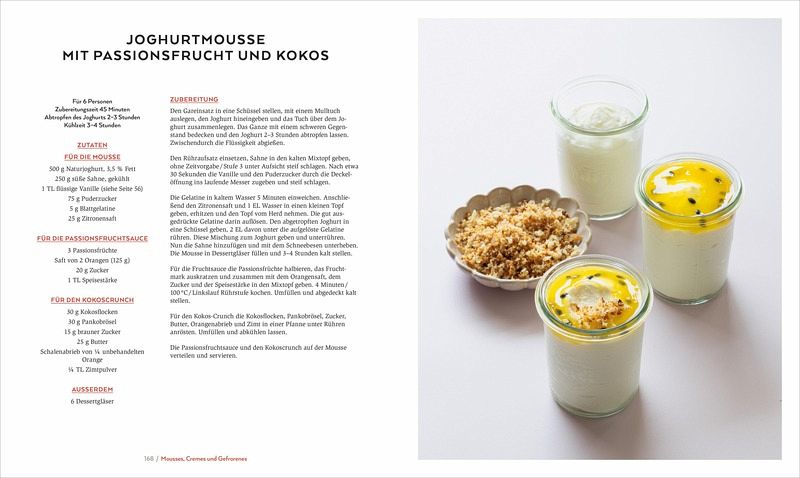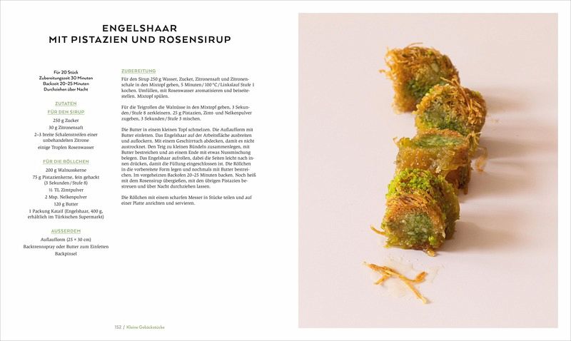 Die Rezepte selbst sind außergewöhnlich und kreativ: Engelshaar mit Pistazien. Und Rosensirup, Lebkuchen: Mousse mit Physalis, Limetten-Sorbet oder Schoko-Kokos-Tartlets – alles ist besonders, aber dennoch gut umsetzbar. Zutaten und Zubereitung sind klar und übersichtlich strukturiert. Man merkt sofort: Hier wurde mit viel Liebe zum Detail gearbeitet.