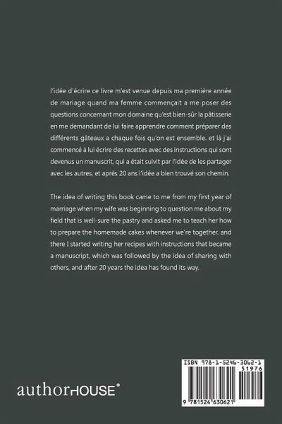 l'idée d'écrire ce livre m'est venue depuis ma première année de mariage quand ma femme commençait a me poser des questions concernant mon domaine qu'est bien-sûr la pâtisserie en me demandant de lui faire apprendre comment préparer des différents gâteaux a chaque fois qu'on est ensemble. et là j'ai commencé à lui écrire des recettes avec des instructions qui sont devenus un manuscrit, qui a était suivit par l'idée de les partager avec les autres, et après 20 ans l'idée a bien trouvé son chemin. The idea of writing this book came to me from my first year of marriage when my wife was beginning to question me about my field that is well-sure the pastry and asked me to teach her how to prepare the homemade cakes whenever we're together. and there I started writing her recipes with instructions that became a manuscript, which was followed by the idea of sharing with others, and after 20 years the idea has found its way.