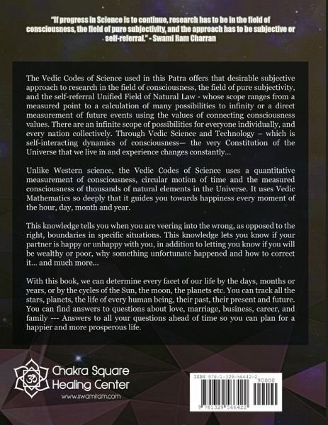 The Patra, first translated in English by Swami Ram Charran 25 years ago, was formally known as "The Panchang," a Hindu Astronomical Calendar that accurately tracks the lives of all individuals as well as the Earth changes as they take place from year to year. This knowledge has been used by Ancient Astrologers and Modern Pundits for centuries to forecast and avoid upcoming disasters in people's lives and in countries before they happened. The Vedic Code of Science, unlike Western science, uses a quantitative measurement of consciousness, circular motion of time and the measured consciousness of thousands of natural elements in the Universe. It uses Vedic Mathematics so deeply that it guides you towards happiness every moment of the hour, day, month and year. . This knowledge tells you when you are veering into the wrong, as opposed to the right, boundaries in specific situations...and much more!