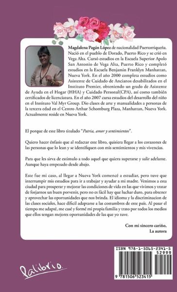 El porque de este libro titulado Patria, amor y sentimientos. Quiero hacer nfasis que al redactar este libro, quisiera llegar a los corazones de las personas que lo lean y se identifiquen con mis sentimientos y mis vivencias. Para que les sirva de estimulo a todo aquel que quiera superarse y salir adelante. Aunque haya empezado desde abajo. Este fue mi caso, al llegar a Nueva York comenc a estudiar, pero tuve que interrumpir mis estudios para ir a trabajar y ayudar a mi madre. Venimos a esta ciudad para prosperar y mejorar las condiciones de vida en las que vivimos y tratar de forjarnos un buen porvenir, pero no es fcil hay que luchar duro, para obtener y aprovechar las oportunidades que nos brinda. El idioma y la discriminacion de las clases sociales, hace dficil adaptarse a las costumbres de este pas. Al pasar el tiempo me adapt, me cas y form mi propia familia y trato por todos los medios que ellos tengan mejores oportunidades de las que yo tuve. Con mi sincero cario, La autora