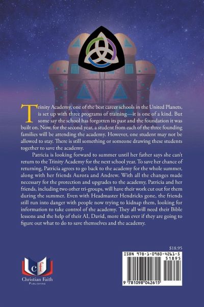 Trinity Academy, one of the best career schools in the United Planets, is set up with three programs of training-it is one of a kind. But some say the school has forgotten its past and the foundation it was built on. Now, for the second year, a student from each of the three founding families will be attending the academy. However, one student may not be allowed to stay. There is still something or someone drawing these students together to save the academy. Patricia is looking forward to summer until her father says she can't return to the Trinity Academy for the next school year. To save her chance of returning, Patricia agrees to go back to the academy for the whole summer, along with her friends Aurora and Andrew. With all the changes made necessary for the protection and upgrades to the academy, Patricia and her friends, including two other tri-groups, will have their work cut out for them during the summer. Even with Headmaster Hendricks gone, the friends still run into danger with people now trying to kidnap them, looking for information to take control of the academy. They all will need their Bible lessons and the help of their AI, David, more than ever if they are going to figure out what to do to save themselves and the academy.