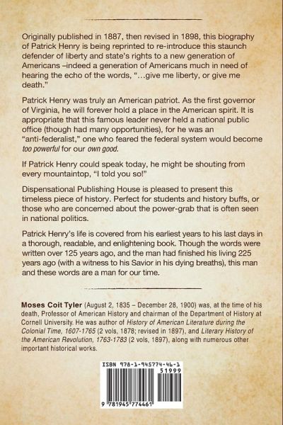 Originally published in 1887, then revised in 1898, this biography of Patrick Henry is being reprinted to re-introduce this staunch defender of liberty and state's rights to a new generation of Americans -indeed a generation of Americans much in need of hearing the echo of the words, "...give me liberty, or give me death." Patrick Henry was truly an American patriot. As the first governor of Virginia, he will forever hold a place in the American spirit. It is appropriate that this famous leader never held a national public office (though had many opportunities), for he was an "anti-federalist," one who feared the federal system would become too powerful for our own good. If Patrick Henry could speak today, he might be shouting from every mountaintop, "I told you so!" Dispensational Publishing House is pleased to present this timeless piece of history. Perfect for students and history buffs, or those who are concerned about the power-grab that is often seen in national politics. Patrick Henry's life is covered from his earliest years to his last days in a thorough, readable, and enlightening book. Though the words were written over 125 years ago, and the man had finished his living 225 years ago (with a witness to his Savior in his dying breaths), this man and these words are a man for our time.