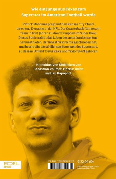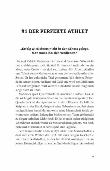 Wer ist dieser Patrick Mahomes, wie ist der Sohn eines Baseball-Profis zu dem geworden, der er ist? Wie verlief seine Kindheit in Texas, seine Karriere am College, sein Einstieg in die NFL? Wie tickt er privat? Und: Was muss man alles über die Kansas City Chiefs wissen, die 2023 ihr erstes NFL-Game in Deutschland spielten, das nicht nur sportlich, sondern auch durch die Liaison von Taylor Swift und Mahomes' Teamkollegen Travis Kelce für Schlagzeilen sorgte?