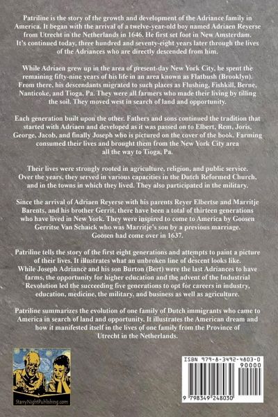 Patriline is the story of the growth and development of the Adriance family in America. It began with the arrival of a twelve-year-old boy named Adriaen Reyerse from Utrecht in the Netherlands in 1646. He first set foot in New Amsterdam. It's continued today, three hundred and seventy-eight years later through the lives of the Adriances who are directly descended from him. While Adriaen grew up in the area of present-day New York City, he spent the remaining fifty-nine years of his life in an area known as Flatbush (Brooklyn). From there, his descendants migrated to such places as Flushing, Fishkill, Berne, Nanticoke, and Tioga, Pa. They were all farmers who made their living by tilling the soil. They moved west in search of land and opportunity. Each generation built upon the other. Fathers and sons continued the tradition that started with Adriaen and developed as it was passed on to Elbert, Rem, Joris, George, Jacob, and finally Joseph who is pictured on the cover of the book. Farming consumed their lives and brought them from the New York City area all the way to Tioga, Pa. Their lives were strongly rooted in agriculture, religion, and public service. Over the years, they served in various capacities in the Dutch Reformed Church, and in the towns in which they lived. They also participated in the military. Since the arrival of Adriaen Reyerse with his parents Reyer Elbertse and Marritje Barents, and his brother Gerrit, there have been a total of thirteen generations who have lived in New York. They were inspired to come to America by Goosen Gerritse Van Schaick who was Marritje's son by a previous marriage. Goosen had come over in 1637. Patriline tells the story of the first eight generations and attempts to paint a picture of their lives. It illustrates what an unbroken line of descent looks like. While Joseph Adriance and his son Burton (Bert) were the last Adriances to have farms, the opportunity for higher education and the advent of the Industrial Revolution led the succeeding five generations to opt for careers in industry, education, medicine, the military, and business as well as agriculture. Patriline summarizes the evolution of one family of Dutch immigrants who came to America in search of land and opportunity. It illustrates the American dream and how it manifested itself in the lives of one family from the Province of Utrecht in the Netherlands.