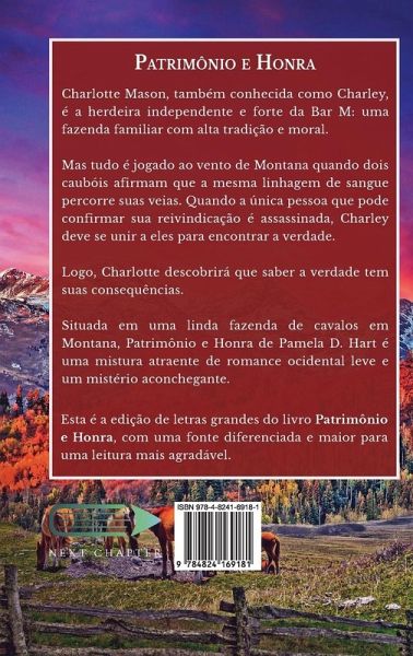 Charlotte Mason, também conhecida como Charley, é a herdeira independente e forte da Bar M: uma fazenda familiar com alta tradição e moral. Mas tudo é jogado ao vento de Montana quando dois caubóis afirmam que a mesma linhagem de sangue percorre suas veias. Quando a única pessoa que pode confirmar sua reivindicação é assassinada, Charley deve se unir a eles para encontrar a verdade. Logo, Charlotte descobrirá que saber a verdade tem suas consequências. Situada em uma linda fazenda de cavalos em Montana, Patrimônio e Honra de Pamela D. Hart é uma mistura atraente de romance ocidental leve e um mistério aconchegante. Esta é a edição de letras grandes do livro Patrimônio e Honra, com uma fonte diferenciada e maior para uma leitura mais agradável.