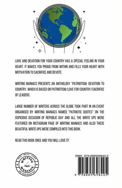 Love and Devotion for your country has a special feeling in your heart. It makes you proud from within and fills your heart with motivation to sacrifice and devote. Writing Maniacs presents an anthology ""PATRIOTISM: DEVOTION TO COUNTRY, which is based on Patriotism/Love for Country/Sacrifice of Leaders. Large number of writers across the globe took part in an event organised by Writing Maniacs named ""Patriotic Quotes"" on the ospicious occasion of Republic Day and all the write ups were featured on Instagram page of Writing Maniacs and also these beautiful write ups were compiled into this book. Read this book once and you will Love It!