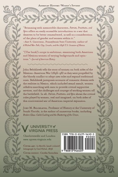 In Patriots, Prostitutes, and Spies, John M. Belohlavek tells the story of women on both sides of the Mexican-American War (1846-48) as they were propelled by the bloody conflict to adopt new roles and expand traditional ones. American women "back home" functioned as anti-war activists, pro-war supporters, and pioneering female journalists. Others moved west and established their own reputations for courage and determination in dusty border towns or bordellos. Women formed a critical component of the popular culture of the period, as trendy theatrical and musical performances drew audiences eager to witness tales of derring-do, while contemporary novels, in tales resplendent with heroism and the promise of love fulfilled, painted a romanticized picture of encounters between Yankee soldiers and fair Mexican senoritas. Belohlavek juxtaposes these romantic dreams with the reality in Mexico, which included sexual assault, women soldaderas marching with men to provide critical supportive services, and the challenges and courage of working women off the battlefield. In all, Belohlavek shows the critical roles played by women, real and imagined, on both sides of this controversial war of American imperial expansion.
