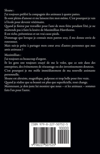 Sloane : J'ai toujours préféré la compagnie des animaux à quatre pattes. Ils sont pleins d'amour et me laissent être moi-même. C'est pourquoi je vais à l'école pour devenir vétérinaire. Quand je finirai par travailler pour l'ami de mon frère pendant l'été, je ne m'attends pas à faire la lessive de Maximillian Hawthorne. Il est riche, prétentieux et un vrai casse-pieds. Dommage que lorsque je connais mon patron sexy, il me donne envie de ronronner. Mais suis-je prête à partager mon c¿ur avec d'autres personnes que mes amis animaux ? Maximillian : J'ai toujours eu beaucoup d'argent. Et les gens ont toujours essayé de me le voler, que ce soit dans des entreprises, des événements de réseautage ou des investissements douteux. C'est pourquoi je me méfie immédiatement de ma nouvelle assistante personnelle. Sloane est altruiste, magnifique, pulpeuse et trop belle pour être vraie. Quand je réalise que sa beauté est plus que superficielle, tout change. Maintenant, je dois juste lui montrer que nous - et les animaux - sommes faits l'un pour l'autre.
