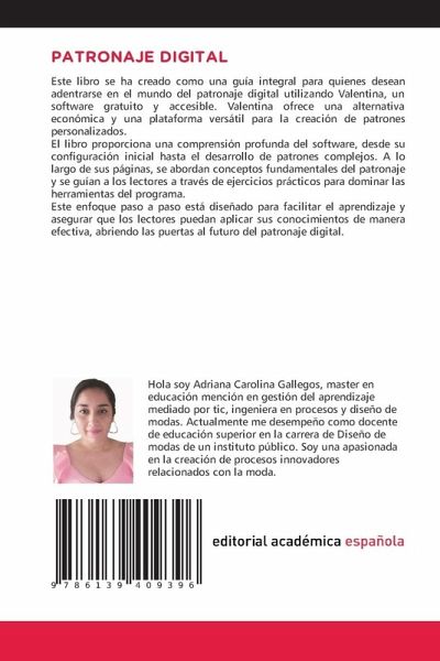 Este libro se ha creado como una guía integral para quienes desean adentrarse en el mundo del patronaje digital utilizando Valentina, un software gratuito y accesible. Valentina ofrece una alternativa económica y una plataforma versátil para la creación de patrones personalizados.El libro proporciona una comprensión profunda del software, desde su configuración inicial hasta el desarrollo de patrones complejos. A lo largo de sus páginas, se abordan conceptos fundamentales del patronaje y se guían a los lectores a través de ejercicios prácticos para dominar las herramientas del programa.Este enfoque paso a paso está diseñado para facilitar el aprendizaje y asegurar que los lectores puedan aplicar sus conocimientos de manera efectiva, abriendo las puertas al futuro del patronaje digital.