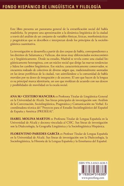 Este libro presenta un panorama general de la estratificación social del habla madrileña. Se propone una aproximación a la dinámica lingüística de la ciudad a través del análisis de un conjunto de variables fónicas, léxicas, morfosintácticas y pragmáticas que se describen e interpretan desde los principios de la sociolingüística cuantitativa. La investigación se desarrolla a partir de dos corpus de habla, uno del distrito de Salamanca y otro de Vallecas, dos distritos muy diferenciados socioeconómica y lingüísticamente. Desde su estudio, Madrid se revela como una ciudad lingüísticamente heterogénea, con un núcleo social que dirige las nuevas tendencias y lidera los cambios lingüísticos. Ese núcleo, característicamente conservador, se encuentra rodeado de colectivos de diverso origen que, tradicionalmente asentados en las áreas periféricas de la ciudad, van asimilándose a la comunidad de habla movidos por su deseo de integración y de ascenso. El uso que hacen de la lengua es su principal marca identitaria, un uso que moldean de acuerdo a sus deseos y posibilidades de movilidad en la escala social.