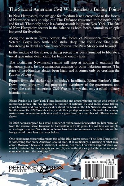 The Second American Civil War Reaches a Boiling Point In New Hampshire, the struggle for freedom is at a crescendo as the forces of Newmerica seek to wipe out The Defiance resistance in the north once and for all. Their only hope is a daring assault in upstate New York. The fate of New Hampshire teeters in the balance as both forces commit to an epic last stand for freedom. Along the western Texas border, the forces of Newmerica throw their Veteran Corps into battle and strike deep into the Lone Star state, threatening to derail an American offensive into New Mexico and beyond. In the middle of the chaos, a daring rescue has been launched to liberate a social quarantine death camp far behind enemy lines. The totalitarian Newmerica regime will stop at nothing to eradicate the American cause, be it assassination attempts or other nefarious means. The price of freedom has always been high, and it comes only by crushing the Patrons of Terror. Ripped from the darker side of today's headlines, Blaine Pardoe's Blue Dawn series starts with the progressive overthrow of the government and covers the second American Civil War in a way that only a gifted military historian can.