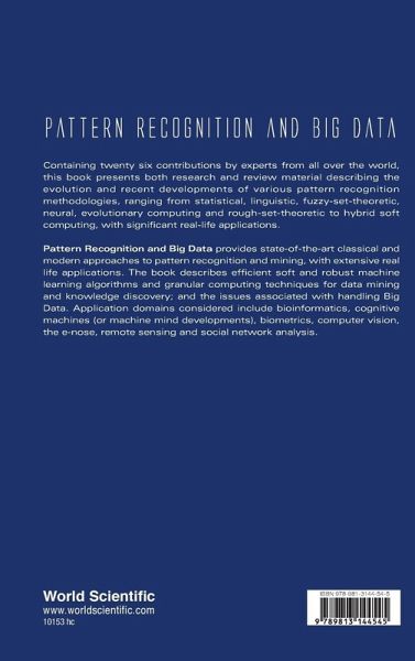 Containing twenty six contributions by experts from all over the world, this book presents both research and review material describing the evolution and recent developments of various pattern recognition methodologies, ranging from statistical, linguistic, fuzzy-set-theoretic, neural, evolutionary computing and rough-set-theoretic to hybrid soft computing, with significant real-life applications. Pattern Recognition and Big Data provides state-of-the-art classical and modern approaches to pattern recognition and mining, with extensive real life applications. The book describes efficient soft and robust machine learning algorithms and granular computing techniques for data mining and knowledge discovery; and the issues associated with handling Big Data. Application domains considered include bioinformatics, cognitive machines (or machine mind developments), biometrics, computer vision, the e-nose, remote sensing and social network analysis.