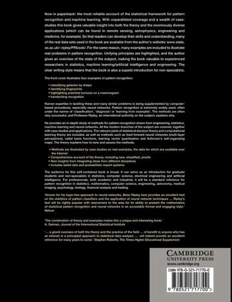 This 1996 book is a reliable account of the statistical framework for pattern recognition and machine learning. With unparalleled coverage and a wealth of case-studies this book gives valuable insight into both the theory and the enormously diverse applications (which can be found in remote sensing, astrophysics, engineering and medicine, for example). So that readers can develop their skills and understanding, many of the real data sets used in the book are available from the author's website: www.stats.ox.ac.uk/~ripley/PRbook/. For the same reason, many examples are included to illustrate real problems in pattern recognition. Unifying principles are highlighted, and the author gives an overview of the state of the subject, making the book valuable to experienced researchers in statistics, machine learning/artificial intelligence and engineering. The clear writing style means that the book is also a superb introduction for non-specialists.
