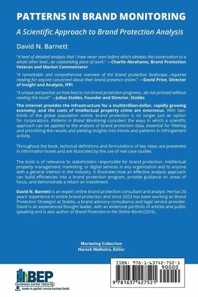 The Internet provides the infrastructure for a multi-trillion dollar, rapidly growing economy and the costs of intellectual property crime are enormous. With two-thirds of the global population online, brand protection is no longer just an option for corporations. Patterns in Brand Monitoring considers the ways in which a scientific approach can be applied to the analysis of brand protection data, essential for filtering and prioritizing the results and yielding insights into trends and patterns in infringement activity. Throughout the book, technical definitions and formulations of key ideas are presented in information boxes and are illustrated by the use of real case studies. The book is of relevance to stakeholders responsible for brand protection, intellectual property management, marketing or digital services in any organization, and to anyone with a general interest in the industry. It illustrates how an effective analysis approach can build efficiencies into a brand protection program, provide guidance on areas of focus, and demonstrate return on investment.