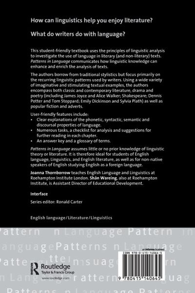 "Patterns in Language" addresses the real needs of students who may not have an extensive background either in traditional literature or in linguistic theory. This student-friendly textbook uses the principles of linguistic analysis to investigate the aesthetic use of language in literary (and non-literary) texts. Written in straightforward, accessible language with imaginative examples and a humorous tone, it shows how linguistic knowledge can enhance and enrich the analysis of texts. The authors borrow from traditional stylistics, but focus primarily on the recurring linguistic patterns which are used by writers of poetry, fiction and drama. The authors draw on a wide variety of textual sources to illustrate their observations, making reference to both canonical literature and modern literary texts, as well as to popular fiction, television and the language of advertising. Exercises designed to develop the students' understanding of the material are provided at every stage, and sample answers are alsoincluded.