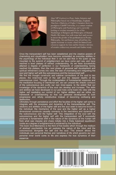 Once the transcendent self has been established and the creative powers of channeling and visualization have become embedded as everyday abilities in the psychology of the individual then it can be said that in the quest up the mountain to the summit of enlightenment we have come part way and have reached a level plateau of refined understanding. As we have successfully attained a degree of perfection in our framework of understanding having reached this plateau, then the next phase of personal self development and spiritual refinement comes into view; the task of channeling and integrating the soul and higher self with the subconscious and the transcendent self. This book Soul Mechanics is the third of five books which through the medium of abstract psychedelic line art explores the nature of the mind and the subconscious alongside the self and the soul.