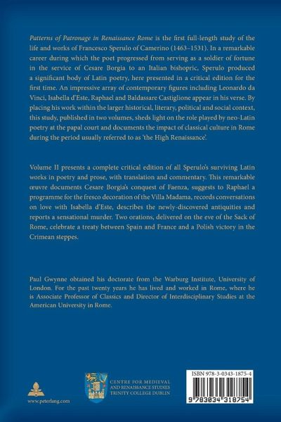 Patterns of Patronage in Renaissance Rome is the first full-length study of the life and works of Francesco Sperulo of Camerino (1463-1531). In a remarkable career during which the poet progressed from serving as a soldier of fortune in the service of Cesare Borgia to an Italian bishopric, Sperulo produced a significant body of Latin poetry, here presented in a critical edition for the first time. An impressive array of contemporary figures including Leonardo da Vinci, Isabella d'Este, Raphael and Baldassare Castiglione appear in his verse. By placing his work within the larger historical, literary, political and social context, this study, published in two volumes, sheds light on the role played by neo-Latin poetry at the papal court and documents the impact of classical culture in Rome during the period usually referred to as «the High Renaissance».