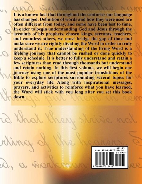 It is a known fact that throughout the centuries our language has changed. Definition of words and how they were used are often different from today, and some have been lost to time. In order to begin understanding God and Jesus through the accounts of his prophets, chosen kings, servants, teachers, and countless others, we must bridge the gap of time and make sure we are rightly dividing the Word in order to truly understand it. True understanding of the living Word is a lifelong journey that cannot be rushed or done quickly to keep a schedule. It is better to fully understand and retain a few scriptures than read through thousands but understand and retain nothing. In this first volume, we will begin our journey using one of the most popular translations of the Bible to explore scriptures surrounding several topics for your everyday life. Along with inspirational messages, prayers, and activities to reinforce what you have learned, the Word will stick with you long after you set this book down.