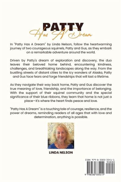 In "Patty Has A Dream" by Linda Nelson, follow the heartwarming journey of two courageous squirrels, Patty and Gus, as they embark on a remarkable adventure around the world. Driven by Patty's dream of exploration and discovery, the duo leaves their beloved home behind, encountering kindness, challenges, and breathtaking landscapes along the way. From the bustling streets of distant cities to the icy wonders of Alaska, Patty and Gus face fears and forge friendships that will last a lifetime. As they navigate their way back home, Patty and Gus discover the true meaning of love, friendship, and the importance of belonging. With the support of their squirrel community and the special significance of their blue ribbons, they learn that home is not just a place-it's where the heart finds peace and love. "Patty Has A Dream" is a touching tale of courage, resilience, and the power of dreams, reminding readers of all ages that with love and determination, anything is possible.