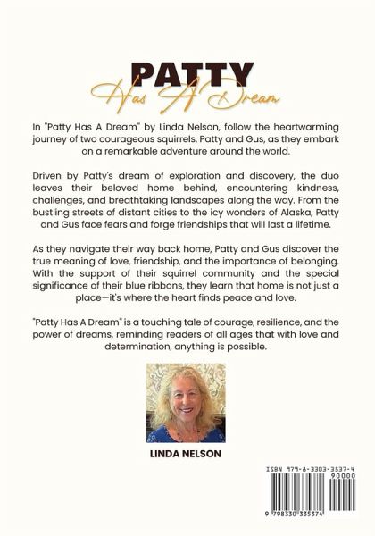 In "Patty Has A Dream" by Linda Nelson, follow the heartwarming journey of two courageous squirrels, Patty and Gus, as they embark on a remarkable adventure around the world. Driven by Patty's dream of exploration and discovery, the duo leaves their beloved home behind, encountering kindness, challenges, and breathtaking landscapes along the way. From the bustling streets of distant cities to the icy wonders of Alaska, Patty and Gus face fears and forge friendships that will last a lifetime. As they navigate their way back home, Patty and Gus discover the true meaning of love, friendship, and the importance of belonging. With the support of their squirrel community and the special significance of their blue ribbons, they learn that home is not just a place-it's where the heart finds peace and love. "Patty Has A Dream" is a touching tale of courage, resilience, and the power of dreams, reminding readers of all ages that with love and determination, anything is possible.