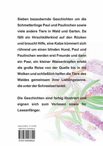 Sieben bezaubernde Geschichten um die Schmetterlinge Paul und Paulinchen sowie viele andere Tiere in Wald und Garten. Da fällt ein Hirschkäferkind auf den Rücken und braucht Hilfe, eine Katze kümmert sich rührend um einen blinden Hund, Paul und Paulinchen werden erst Freunde und dann ein Paar, ein kleiner Wassertropfen erlebt die große Reise von der Quelle bis in die Wolken und schließlich helfen die Tiere des Waldes gemeinsam ihrer Lieblingstanne, die unter der Schneelast leidet. Die Geschichten sind farbig illustriert und eignen sich zum Vorlesen sowie Leseanfänger.