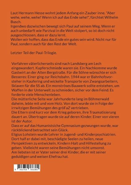 Laut Hermann Hesse wohnt jedem Anfang ein Zauber inne. "Aber wehe, wehe, wehe! Wenn ich auf das Ende sehe!", fürchtet Wilhelm Busch. Irgendwo dazwischen bewegt sich Paul auf seinem Weg. Wenn er auch unbedarft wie Parzival in die Welt stolpert, so ist doch nicht ausgeschlossen, dass er dazu lernt. Wollen wir hoffen, dass das Ende ein gutes sein wird. Nicht nur für Paul, sondern auch für den Rest der Welt.Letzter Teil der Paul-Trilogie.