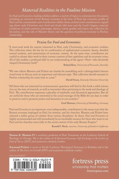 The social context of Paul's mission and congregations has been the study of intense investigation for decades, but only in recent years have questions of economic realities and the relationship between rich and poor come to the forefront. In Paul and Economics, leading scholars address a variety of topics in contemporary discussion, including an overview of the Roman economy; the economic profile of Paul and of his communities, and stratification within them; architectural considerations regarding where they met; food and drink, idol meat, and the Lord's Supper; material conditions of urban poverty; patronage; slavery; travel; gender and status; the collection for Jerusalem; and the role of Marxist theory and the question of political economy in Paul scholarship--