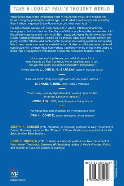 Biblical Foundations Award Finalist What forces shaped the intellectual world of the apostle Paul? How familiar was he with the great philosophers of his age, and to what extent was he influenced by them? When he quoted Greco-Roman sources, what was his aim? Pauline scholars wrestle with such questions in journal articles and technical monographs, but now Paul and the Giants of Philosophy brings the conversation into the college classroom and the church. Each essay addresses Paul's interaction with Greco-Roman philosophical thinking on a particular topic, such as faith, slavery, gift-giving, and the afterlife. And each chapter includes discussion questions and reading lists to help readers engage the material further. Dodson and Briones have gathered contributors with diverse views from various traditions who are united in the desire to make Paul's engagement with ancient philosophy accessible to many readers.