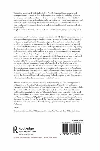 German music critic and opera producer Paul Bekker (1882-1937) is a rare example of a critic granted the opportunity to turn his ideas into practice. In this first full-length study of Bekker in English, Nanette Nielsen investigates Bekker's theory and practice in light of ethics and aesthetics, in order to uncover the ways in which these intersect in his work and contributed to the cultural and political landscape of the Weimar Republic. By linking Beethoven's music to issues of freedom and individuality, as he argues for its potential to unify the masses, Bekker had already in 1911 begun to construct the ethical framework for his musical sociology and opera aesthetics. Nielsen discusses some of the complex (and conflicting) layers of modernism and conservatism in Bekker that would have a continued presence in his work and its reception throughout his career. Bekker's demands for a 'practical ethics' led to his criticisms of metaphysically grounded approaches to aesthetics, and his ethical views are put into further relief in a sketch of the development of his music phenomenology in the 1920s. Nielsen unravels the complex intersections between Bekker's ethics and his opera aesthetics in connection with his practice as an Intendant at the Wiesbaden State Theatre (1927-1932), offering a critical reading of an opera staged during his tenure: Hugo Herrmann's Vasantasena (1930). Further works are considered in light of the theoretical framework underpinning the book, inspired by several intersections between ethics and aesthetics encountered in Bekker's work.