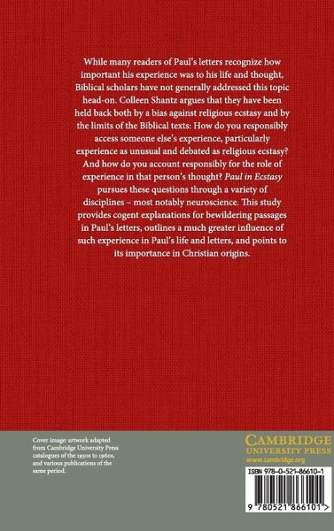 While many readers of Paul's letters recognize how important his experience was to his life and thought, Biblical scholars have not generally addressed this topic head-on. Colleen Shantz argues that they have been held back both by a bias against religious ecstasy and by the limits of the Biblical texts: how do you responsibly access someone else's experience, particularly experience as unusual and debated as religious ecstasy? And how do you account responsibly for the role of experience in that person's thought? Paul in Ecstasy pursues these questions through a variety of disciplines - most notably neuroscience. This study provides cogent explanations for bewildering passages in Paul's letters, outlines a much greater influence of such experience in Paul's life and letters, and points to its importance in Christian origins.