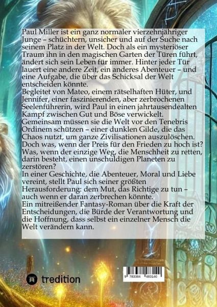 Paul Miller ist ein ganz normaler vierzehnjähriger Junge - schüchtern, unsicher und auf der Suche nach seinem Platz in der Welt. Doch als ein mysteriöser Traum ihn in den magischen Garten der Türen führt, ändert sich sein Leben für immer. Hinter jeder Tür lauert eine andere Zeit, ein anderes Abenteuer - und eine Aufgabe, die über das Schicksal der Welt entscheiden könnte.Begleitet von Mateo, einem rätselhaften Hüter, und Jennifer, einer faszinierenden, aber zerbrochenen Seelenführerin, wird Paul in einen jahrtausendealten Kampf zwischen Gut und Böse verwickelt. Gemeinsam müssen sie die Welt vor den Tenebris Ordinem schützen - einer dunklen Gilde, die das Chaos nutzt, um ganze Zivilisationen auszulöschen.Doch was, wenn der Preis für den Frieden zu hoch ist?Was, wenn der einzige Weg, die Menschheit zu retten, darin besteht, einen unschuldigen Planeten zu zerstören?In einer Geschichte, die Abenteuer, Moral und Liebe vereint, stellt Paul sich seiner größten Herausforderung: dem Mut, das Richtige zu tun - auch wenn er daran zerbrechen könnte.Ein mitreißender Fantasy-Roman über die Kraft der Entscheidungen, die Bürde der Verantwortung und die Hoffnung, dass selbst ein einzelner Mensch die Welt verändern kann.