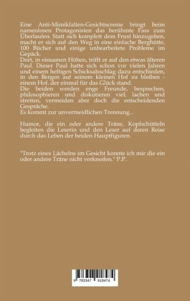 Eine Anti-Mimik-Falten-Creme bringt den ureigensten Frust, den unser namenlose Hauptperson in sich trägt, zum Überschäumen. Er nutzt diese Energie für Veränderung, beginnt, sich auf den Weg zu machen und trifft auf Paul, unseren zweiten Hauptdrarsteller. Gemeinsam leben sie in den Bergen, ein jeder für sich und doch freundschaftlich verbunden. Jeder schleppt sein Lebenspaket, seine Vergangenheit, die Gegenwart und die unausweichliche Zukunft mit sich herum. Sie diskutieren, agieren, lachen, weinen, sind völlig durchgeknallt. Nach einem Jahr kommt es zu dramatischen Veränderungen, aber das Leben geht weiter.