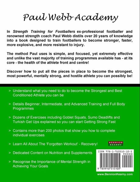 In 'Strength Training for Footballers' ex-professional footballer and renowned strength coach Paul Webb distils over 20 years of knowledge into a book designed to train footballers to become stronger, faster, more explosive, and more resistant to injury. The method Paul uses is simple, and focused, yet extremely effective and unlike the vast majority of training programmes available has - at its core - the health of the athlete front and centre! Discover how to put all the pieces in place to become the strongest, most powerful, mentally strong, and hostile athlete you can possibly be! What you will learn: > Understand what you need to do to become the Strongest and Best Conditioned Athlete you can be > Details Beginner, Intermediate, and Advanced Training and Full Body Programmes > Dozens of Exercises including Goblet Squats, Sumo Deadlifts and Turkish Get Ups explained so you can start Getting Strong Fast > Contains more than 200 photos that show you how to complete individual exercises > Learn All About The 'Forgotten Workout' - Recovery! > Dedicated Content on Nutrition and Supplements > Recognise the Importance of Mental Strength in Achieving Your Goals Please Note: There is a level of content overlap between books in this series, so please choose the most appropriate book for you.