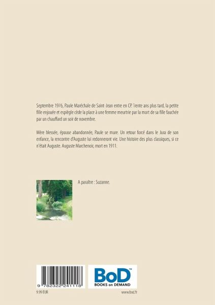 Septembre 1976, Paule Maréchale de Saint-Jean entre en CP. Trente ans plus tard, la petite fille enjouée et espiègle cède la place à une femme meurtrie par la mort de sa fille fauchée par un chauffard un soir de novembre.Mère blessée, épouse abandonnée, Paule se mure. Un retour forcé dans le Jura de son enfance, la rencontre d'Auguste lui redonneront vie. Une histoire des plus classiques, si ce n'était Auguste. Auguste Marchenoir, mort en 1911.