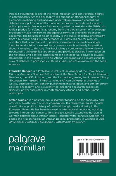 "Franziska Dübgen and Stefan Skupien have written a much needed overview of Paulin Hountondji's work. ... Readers who are interested in African philosophy, the sociology of scientific knowledge, African Marxism and dependency theory will find much of interest in Paulin Hountondji." (Zeyad el Nabolsy, Marx and Philosophy, marxandphilosophy.org.uk, June 14, 2020) "Through quite remarkable scholarship, Dubgen and Skupien manage to piece together engraved patterns of logic, coherence and conceptual intrigue in Hountondji's eventful life and career, which have been marked by meteoric peaks and bouts of furious activity. The book's other major strength is that it provides a sequential context that is not always evident in the pace and texture of Hountondji's often inspirational and faintly apocalyptic writings." (Sanya Osha, The Johannesburg Review of Books, October 07, 2019)