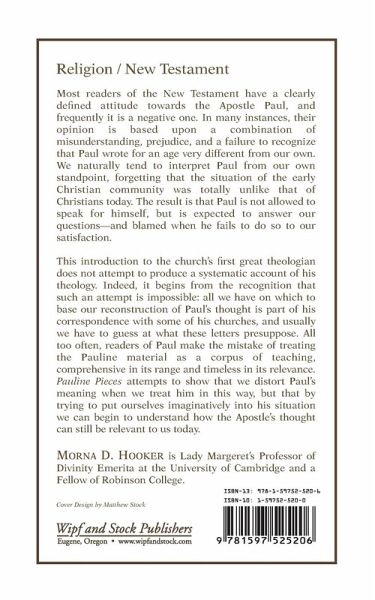 Most readers of the New Testament have a clearly defined attitude towards the Apostle Paul, and frequently it is a negative one. In many instances, their opinion is based upon a combination of misunderstanding, prejudice, and a failure to recognize that Paul wrote for an age very different from our own. We naturally tend to interpret Paul from our own standpoint, forgetting that the situation of the early Christian community was totally unlike that of Christians today. The result is that Paul is not allowed to speak for himself, but is expected to answer our questions--and blamed when he fails to do so to our satisfaction. This introduction to the church's first great theologian does not attempt to produce a systematic account of his theology. Indeed, it begins from the recognition that such an attempt is impossible: all we have on which to base our reconstruction of Paul's thought is part of his correspondenc with some of his churches, and usually we have to guess at what these letters presuppose. All too often, readers of Paul make the mistake of treating the Pauline material as a corpus of teaching, comprehensive in its range and timeless in its relevance. Pauline Pieces attempts to show that we distort Paul's meaning when we treat him in this way, but that by trying to put ourselves imaginatively into his situation we can begin to understand how the Apostle's thought can still be relevant to us today.