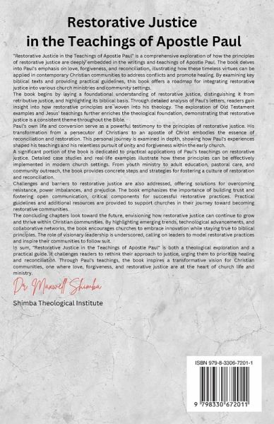 Pauline Principles of Restorative Justice "Pauline Principles of Restorative Justice" by Dr. Maxwell Shimba delves into the timeless teachings of Apostle Paul, uncovering how his writings offer a profound foundation for modern restorative justice practices. The book explores how Paul's emphasis on love, forgiveness, and reconciliation can be effectively applied to address conflicts and heal relationships in contemporary Christian communities. Dr. Shimba provides a detailed analysis of Paul's letters, shedding light on key restorative principles embedded within his theological framework. In this book, Dr. Shimba presents practical applications of Paul's teachings, offering strategies for integrating restorative justice into various church ministries, including youth programs, pastoral care, and community outreach. Through real-life case studies and examples, the book illustrates how restorative practices can transform relationships, promote healing, and build stronger, more united communities. It highlights how restorative justice shifts the focus from punishment to healing, encouraging forgiveness and reconciliation in both personal and communal settings. "Pauline Principles of Restorative Justice" also addresses common challenges such as resistance to change, power dynamics, and prejudice, offering solutions and guidelines for overcoming these obstacles. Dr. Shimba encourages church leaders and communities to embrace the transformative power of restorative justice, grounded in biblical teachings. The book serves as both a theological exploration and a practical guide, inspiring readers to apply Paul's restorative principles in their own lives and ministries.