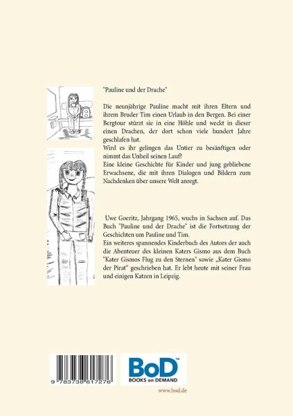 "Pauline und der Drache"Die neunjährige Pauline macht mit ihren Eltern und ihrem Bruder Tim einen Urlaub in den Bergen. Bei einer Bergtour stürzt sie in eine Höhle und weckt in idieser einen Drachen, der schon viele hundert Jahre dort geschlafen hat. Wird es ihr gelingen das Untier zu besänftigen oder nimmt das Unheil seinen Lauf?Eine kleine Geschichte für Kinder und jung gebliebene Erwachsene, die mit ihren Dialogen und Bildern zum Nachdenken über unsere Welt anregt und für Lebendigkeit sowie besondere Nähe zum Geschehen sorgt. Die detailreichen Beschreibungen erschaffen ein besonders plastisches Bild für den Leser.Fazit: Spannend und Lesenswert.