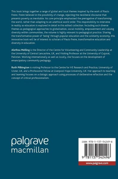 Chapter 1. Introduction; Alethea Melling.- SECTION I. Freire on the International Stage.- Chapter 2. The Relevance of Freire for the Post-2015 Debate on Development and Education and the Role of Popular Education; Tim Ireland.- Chapter 3. Paulo Freire and the Politics of Disposability: Create Critical Dissent Dialogue; Margaret Ledwith.- Chapter 4. Pedagogic challenges to the hegemony of neo-liberal business and management teaching; Tony Bennett.- Chapter 5. Researching to transgress and transform; Deanne Bell.- Chapter 6. Conceptual Landscapes of Global Environmental Consensization; Mahmood Chandia and Bob Walley.- Chapter 7. What should the public role of universities in an unequal society be?; Fernando Lanns Fernandes.- SECTION II. Transforming Communities.- Chapter 8. From Brazil with love: Youth Participation in Scotland: Key Features and Influences; Louise Sheridan.- Chapter 9. The Benefits of Giving: A Study of Learning in the Fourth Age; Trish Hafford Letchfield and Peter Lavender.- Chapter 10. Children and Young People in Dialogue with Researchers to Create Connections in the Community and the Classroom; Candice Satchwell and Cath Larkins.- Chapter 11. Bridging social work Professional Education and Community Work through co-learning and participation in Parenting Programmes; Trish Hafford Letchfield and Bernadette Thomas.- Chapter 12. Consensization and transformation in the workplace: a new form of workplace democracy in the mental health services; Mick McKeown, Fiona Jones and Helen Spandler.- SECTION III. Pedagogies.- Chapter 13. Introduction to Section on Freirean Pedagogy and Educators; Ruth Pilkington.- Chapter 14. The 'pedagogies of partnership': from Blair to Freire?; John Peters.- Chapter 15. A pilot evaluation of a community-based service learning pedagogy within an undergraduate Psychology degree; C Lambert, M Diviney, D Cowman, M Ivers and M Fitzpatrick.- Chapter 16. Freirean Approach within a Peer Led programme; Yasmeen Ali.- Chapter 17. The 'Magic' of Mentoring; Ridwanah Gurjee.- Chapter 18. Moving beyond 'impact': thinking critically about the role of higher education institutions in social transformation; Victoria Jupp Kina, Jean McEwan-Short.- Chapter 19. Teacher Education for Maladjustment: Teaching teachers to gallop and canter through the corridors; Deborah Bentley.- Chapter 20. Nurturing Musical Creativity - A Freirean Approach; Aleksander Szram.- Section IV. Conclusions; Alethea Melling