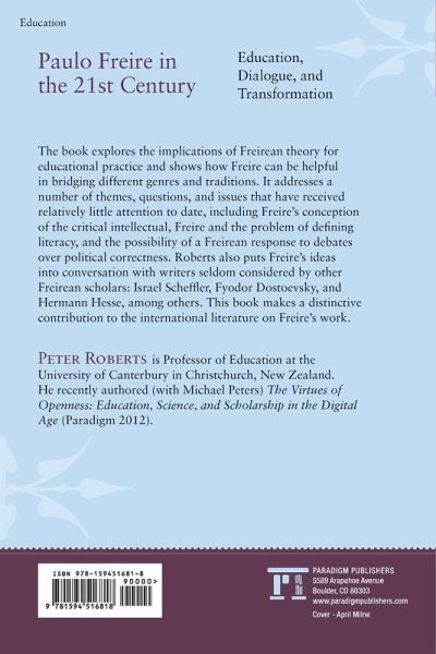 This book explores the implications of world renowned educationalist Paulo Freire's theories for educational practice and how his ideas can help in bridging different genres and traditions. It addresses themes, questions and issues that have received little attention to date, including Freire's conception of the critical intellectual, the problem of defining literacy, and the possibility of a Freirean response to debates over political correctness. Roberts also relates Freire's ideas to those of other writers: Israel Scheffler, Fyodor Dostoevsky and Hermann Hesse, among others. Paulo Freire in the 21st Century makes a distinctive contribution to the international literature on Freire's work.