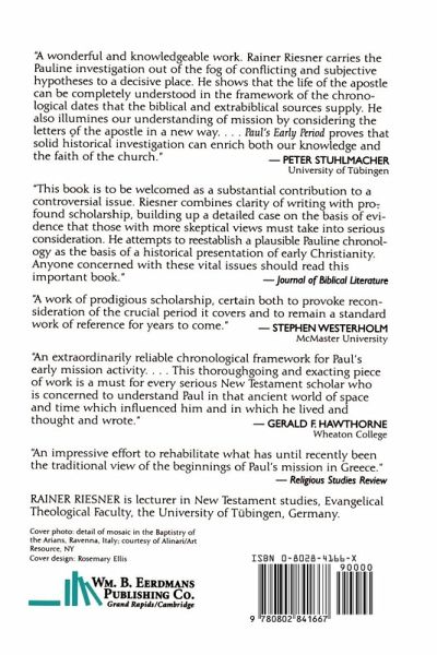 This is a print on demand book and is therefore non- returnable. A description of the first thirty years of the primitive church is largely a description of the course of Paul's life and ministry. A full understanding of Paul's activities and thought is therefore essential for any study of the church or of New Testament theology in general. This thoroughgoing work by Rainer Riesner addresses many of the scholarly questions relating to early Pauline chronology and theology. Conversant with nearly everything of significance written on the subject, this volume will be a valuable aid to the study of Paul and his importance to the early church.