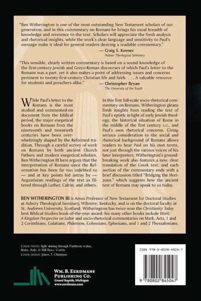 While Paul's letter to the Romans is the most studied and commented-on document from the biblical period, the major exegetical books on Romans from the nineteenth and twentieth centuries have been overwhelmingly shaped by the Reformed tradition. Through a careful survey of work on Romans by both ancient Church Fathers and modern exegetical scholars, Ben Witherington III here argues that the interpretation of Romans since the Reformation has been far too indebted to - and at key points led astray by - Augustinian readings of the text as filtered through Luther, Calvin, and others. In this first full-scale socio-rhetorical commentary on Romans, Witherington gleans fresh insights from reading the text of Paul's epistle in light of early Jewish theology, the historical situation of Rome in the middle of the first century A.D., and Paul's own rhetorical concerns. Giving serious consideration to the social and rhetorical background of Romans allows readers to hear Paul on his own terms, not just through the various voices of his later interpreters. Witherington's groundbreaking work also features a new, clear translation of the Greek text, and each section of the commentary ends with a brief discussion titled "Bridging the Horizons," which suggests how the ancient text of Romans may speak to us today.