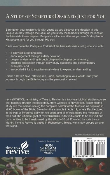 A Study of Scripture Designed Just for You Strengthen your relationship with Jesus as you discover the Messiah in this unique journey through the Bible. As you study these books through the lens of the Messiah, these inspired Scriptures will come alive as you see God's plan for His people, and for you through His son. Each volume in the Complete Portrait of the Messiah series, will guide you with:a daily Bible reading plan, encouragement through a daily devotion, deeper understanding through chapter-by-chapter commentary, practical application through daily study questions and contemporary examples, and embedded links to supplemental videos to expand understanding. Psalm 119:107 says, "Revive me, LORD, according to Your word" Start your journey through the Bible today and be personally revived! reviveSCHOOL, a ministry of Time to Revive, is a two-year biblical studies course that teaches through the Bible daily, from Genesis to Revelation. Teaching and study are focused on seeing the complete portrait of the Messiah as depicted in all 66 books of the Bible. Based on the example in Acts 19, where Paul lectured in the Hall of Tyrannus daily for two years and all of Asia heard the message of the Lord, the ultimate goal of reviveSCHOOL is for individuals to be revived and communities to be transformed by the Word of God. Founded by Kyle Lance Martin, Time to Revive is based in Richardson, Texas, with study groups all over the world.