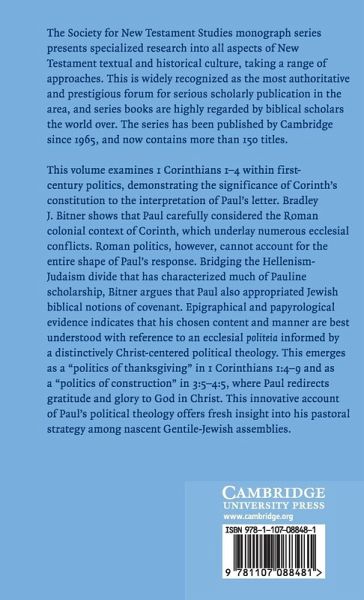 This volume examines 1 Corinthians 1-4 within first-century politics, demonstrating the significance of Corinth's constitution to the interpretation of Paul's letter. Bradley J. Bitner shows that Paul carefully considered the Roman colonial context of Corinth, which underlay numerous ecclesial conflicts. Roman politics, however, cannot account for the entire shape of Paul's response. Bridging the Hellenism-Judaism divide that has characterised much of Pauline scholarship, Bitner argues that Paul also appropriated Jewish-biblical notions of covenant. Epigraphical and papyrological evidence indicates that his chosen content and manner are best understood with reference to an ecclesial politeia informed by a distinctively Christ-centred political theology. This emerges as a 'politics of thanksgiving' in 1 Corinthians 1:4-9 and as a 'politics of construction' in 3:5-4:5, where Paul redirects gratitude and glory to God in Christ. This innovative account of Paul's political theology offers fresh insight into his pastoral strategy among nascent Gentile-Jewish assemblies.