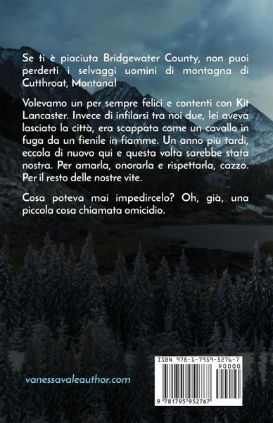 Se ti è piaciuta Bridgewater County, non puoi perderti i selvaggi uomini di montagna di Cutthroat, Montana! Volevamo un per sempre felici e contenti con Kit Lancaster. Invece di infilarsi tra noi due, lei aveva lasciato la città, era scappata come un cavallo in fuga da un fienile in fiamme. Un anno più tardi, eccola di nuovo qui e questa volta sarebbe stata nostra. Per amarla, onorarla e rispettarla, cazzo. Per il resto delle nostre vite. Cosa poteva mai impedircelo? Oh, già, una piccola cosa chiamata omicidio.
