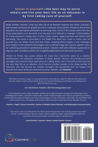 Pause. Breathe. Flourish.: Living Your Best Life as an Educator explores the habits, practices, and mindset necessary for growth as both an educator and a person. Research shows that teachers and principals are leaving the profession of education at alarming rates. Some of the causes stem from the rising expectations and demands that educators find difficult to manage. Unfortunately, for many educators, taking care of others often means neglecting their own health and well-being. How can educators continue doing work they love while also making sure they are protecting themselves in the process? William D. Parker has served schools for more than twenty-five years as a teacher, administrator and education consultant. In Pause. Breathe. Flourish., he provides practical strategies and common-sense approaches for taking better care of yourself so that you can better serve and lead others. Each chapter begins with a mental image and unpacks specific tips for cultivating personal or professional growth. In the pages ahead, you will discover how your thoughts, relationships, commitments, values, and habits play an essential role in who you are as a person. Understanding 'who you are' plays heavily in your ability to weather storms, maintain perspective, work with purpose and effect meaningful change in the lives of others. Applying those insights can be challenging. By reading this book, you will be challenged to reconsider your mindset, reading habits, personal health, financial commitments, relationship priorities, and legacy building. To help you move forward, each chapter ends with reflection questions so that you can take immediate actions for thoughtful application and improved outcomes. Don't become another statistic in the rising number of educators who feel burned out. Instead, reimagine the possibilities that can happen for yourself and those whom you serve when you take time to pause, breathe, and flourish!