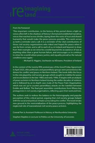 From the Foreword: 'This important contribution...to the history of this period shines a light on voices often left in the shadows of history's formal and established narrative, voices that reached across divides, laying down the roots of trust and shared humanity that would make the peace process possible. This work serves as both a reminder and a call. It is a reminder of the vital contributions of those civil society organisations who risked and hoped for peace when it was far from certain, and a call to each of us, in Ireland and beyond, to draw from their example as we strive for a world beyond the acceptance of war as anything other than a great human failure, and encourages us to continue to strive for a world where peace, justice, and equality prevail as the natural condition once again.' (Michael D. Higgins, Uachtarán na hÉireann, President of Ireland) ¿ In the context of the twenty-fifth anniversary of the Good Friday Agreement in April 2023, elite politicians and paramilitary groups were presented as the drivers for conflict and peace in Northern Ireland. This book shifts the focus to the role played by civil society groups which sought to mobilise for peace and reconciliation in the late 1980s and early 1990s. It begins with an analysis of peace activism in Northern Ireland during the earlier decades of violence and is followed by an in-depth case study of the Peace Train Organisation, which was set up to counter paramilitary attacks on the trainline between Dublin and Belfast. The final part assembles contributions from fifteen key protagonists in civil society organisations, reflecting upon their work and lives.¿ ¿ The authors seek to redress the balance in the historiography and popular perception of this critical period, arguing that civil society groups helped shift the social and political climate surrounding the conflict. The book breaks new ground in the memorialisation of the peace process, highlighting the neglected role of transnational civil society peace activism.