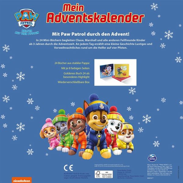Bereite deinen Kleinen eine abenteuerliche Vorweihnachtszeit mit dem PAW Patrol: Mein Adventskalender . Jeden Tag wird ein Türchen geöffnet, hinter dem sich spannende Überraschungen mit den mutigen Helfern auf vier Pfoten verbergen. Chase, Marshall, Skye und alle beliebten Charaktere sind mit von der Partie und sorgen für aufregende Momente im Advent.